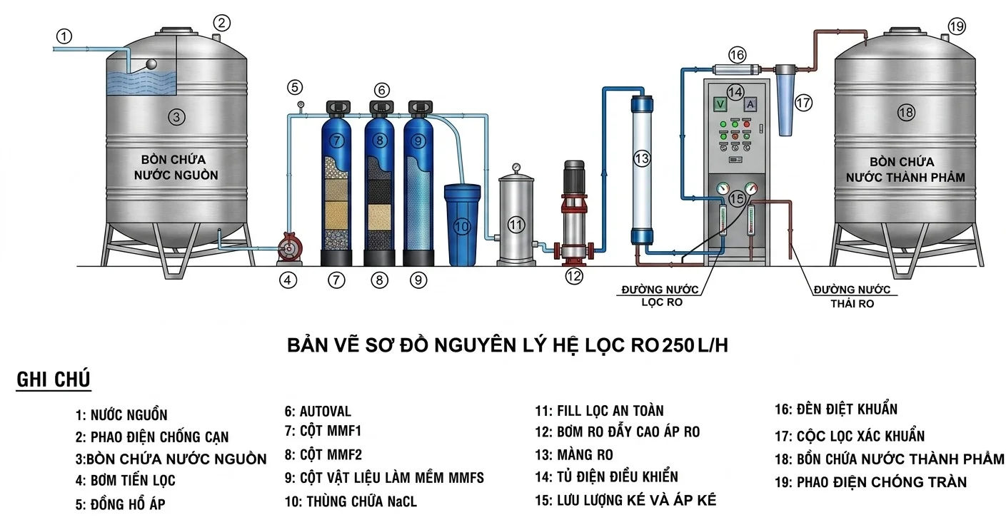 Thông số kỹ thuật của hệ thống lọc nước RO 250l/h